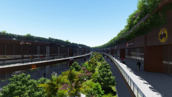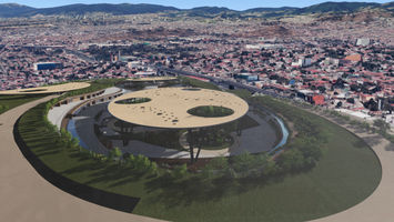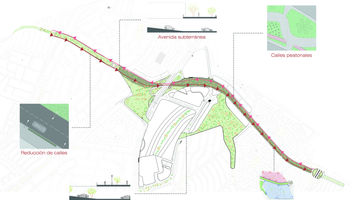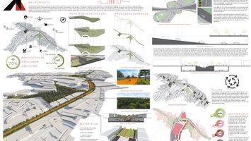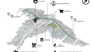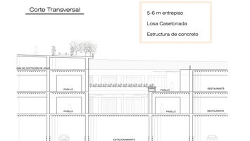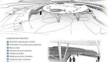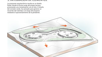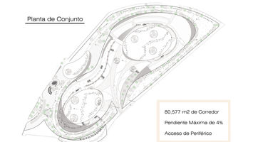 Ahora bien hablando del edificio que enmarcaría el espacio comercial, se resolvió en una forma que fuese parte de su entorno. El proyecto por lo tanto, se diseño como una gran rampa vegetal aprovechando la topografía del lugar con la intención de que el usuario pudiese transitar sobre la misma sintiéndose en un ambiente en armonía con su entorno definido por flujos naturales, espacios abiertos y una accesibilidad mucho mayor al peatón.